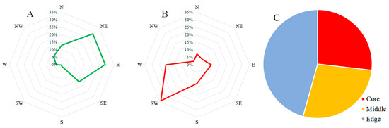 As was expected, dominant winds and blowdown were closely related but occurred in different quadrants of retention patches. A long-term survey showed that 58.1% of blowdown trees (2002–2023) were located in NE to E quadrants (Figure 2A), in the opposite direction to dominant winds (SW to W) (Figure 2B). Furthermore, nearly half of the affected trees were located in Edges (45.7%) compared to Middle (27.5%) or Core areas of retention patches (26.8%). The tree size (37.7% with <40 cm, 39.7% with 40–60 cm, and 22.5% with >60 cm DBH), development stage (25.6% <140 years old, 56.7% 140–220 years old, and 17.7% >220 years old) and canopy layer (6.9% suppressed, 23.4% intermediate, 43.4% codominant, and 26.2% dominant) are not greatly influenced by blowdown. These average values of blowdown trees are similar to those measured in primary forests (PF).