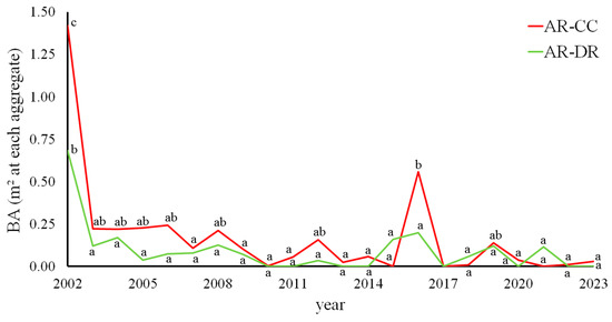 Yearly blowdown basal area (BA) inside the retention patches (m2 at each patch) occurred at two different variable retention designs (AR-CC = aggregates and clear-cuts; AR-DR = aggregates and dispersed retention) at San Justo Ranch. Letters show significant differences using Tukey test among years for each variable retention design. Fisher test and probabilities are presented in Table A2.