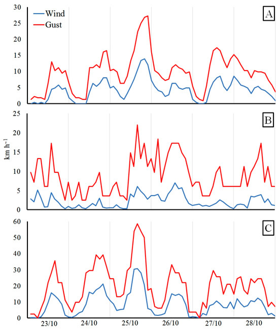 Mean wind speed (blue) and wind gusts (red) at different locations ((A) El Roble Ranch, (B) Rivadavia Ranch, (C) Lenga Patagonia S.A.) during the previous and following days of the studied windstorm event in 2023 (x-axis showed the days and month).