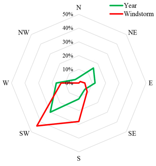 The windstorm occurred during the morning and afternoon of 26 October 2023, and the event was detected across the entire Tierra del Fuego Island (32 km N at El Roble Ranch and 31 km SW at Lenga Patagonia S.A.) (Figure 4). On average, the windstorm presented wind speeds ×1.9 higher than those during the previous and following days and ×1.7 higher when considering the wind gusts. In the study area, most of the trees fell facing the E quadrant (64.1% of affected trees and 63.1% of damaged BA), followed by the S quadrant (24.3% of affected trees and 30.8% of damaged BA) (Figure 5A,B). The dominant winds during the studied event are coming from SW (44.1%), followed by S direction (27.9%), compared to the average values of yearly winds (greater directions were from SW 29.9%, W 16.7%, and NE 15.4% for 2023) (Figure 6). Most of the tree falls occurred in the dispersed retention (87.4%) compared to retention patches (12.6%), as was described before across the studied gradients (Figure 5C). Little differences were observed between blowdown trees under the influence of retention patches (46.7% of affected trees) and trees located far away in the dispersed retention (53.3%). Damaged trees during harvesting, both due to machine operations and extraction path constructions, represented 37.5%–38.1% of blowdown in the dispersed retention, and cumulative damages (e.g., machine operation damages and influence of extraction paths) were not an influential factor to explain the amount of the impact after the windstorm event.