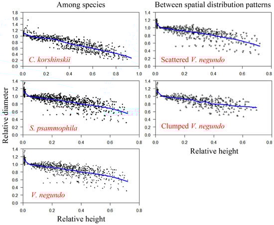 Branch diameters (D, mm) were determined as the average of two perpendicular diameters at the specific branch length (L, cm), taking measurements from the branch base to the tip at the interval of every 10 cm, and more frequently at every 5 cm for smaller branches under 5 mm in diameter. This measurement ceased when at least 75% of the branch’s length was measured due to their highly ramified twigs. Scatter plots of the relative diameter (D/BD, %) to relative length (L/BL, %) were drawn using the “LOESS” regression (smoothing factor 0.25) in R software (Figure 2), following the methodology of Bi (2000) []. This approach helped identify and remove any data anomalies caused by factors such as large knots, epicormic growth, or physical damage []. These anomalies accounted for 0.30%, 0.35%, and 1.42% of the total observations for C. korshinskii, S. psammophila, and V. negundo, respectively, and 1.09% and 1.80% for scattered and clumped V. negundo, respectively. Moreover, the relative diameter, signifying where the diameter’s mild decrease ends and significant shrinking begins along the stem, i.e., the inflection point of branch diameter (IPB, mm) (Figure 3), could be automatically located by inputting the data of scatter plot into R software by running “Segmented” package. The position of the IPB, identified in terms of scattered plots of relative diameter and relative length (Figure 2), was quantified as the distance above the ground along the stem, which was further determined as a percentage of branch length (PBL, %).