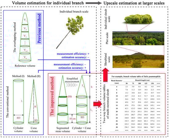 This study provides a standardized measurement for estimating the branch volume of multi-stemmed shrubs by referring to the established tree trunk volume estimations (e.g., the segmented bolts and volume tables). Via measuring branch diameter along the stem of individual branches (hereafter “branch diameter”) of dominant multi-stemmed shrubs on the semi-arid Loess Plateau in China, including Caragana korshinskii, Salix psammophila, and Vitex negundo, we introduce an improved method for volume prediction. Following the branch shape, this method automatically locates the inflection point of the branch diameter, enabling the division of the branch into a cone-shaped upper segment and a cylindric lower segment. This study specifically aims to (1) justify improved efficiency by addressing the inflection points of branch sizes, (2) validate increased accuracy over the conventional cylinder and cone methods, and (3) apply this method to build two-way volume tables and establish a future shrub volume inventory. Achieving these objectives could provide insights into developing standardized measurement procedures for predicting the branch volume of multi-stemmed shrubs, thus facilitating the analysis of fuel characteristics and serving our decision-making in wildfire prevention and climate policy formulation.