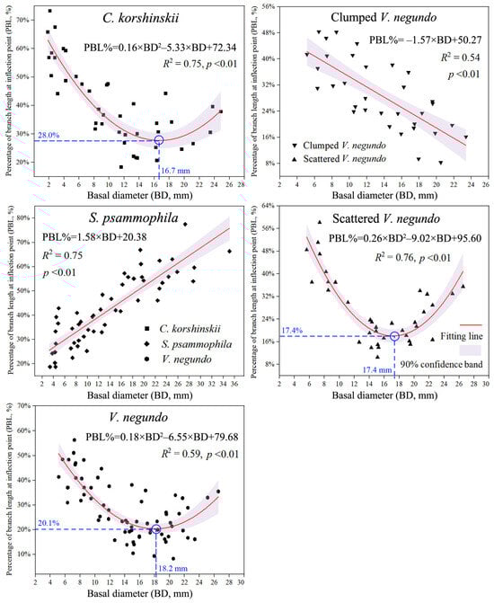 The positions of inflection points of branch diameter (PBL, %) demonstrated variability across different species. Specifically, S. psammophila, C. korshinskii, and V. negundo placed their inflection points at the positions that approximately accounted for a half (45.0%), a third (37.5%), and a quarter (29.7%) of the total branch length, respectively (Table 1). Moreover, the PBL changing trends also varied with species as the size of individual branches (hereafter “branch size”) grew (Figure 4). Both C. korshinskii (R2 = 0.75, p < 0.01) and V. negundo (R2 = 0.59, p < 0.01) exhibited a parabolic pattern in the changes in PBLs with increasing branch size (Figure 4). Initially, for both these species, the inflection points moved to the lower segment and reached the lowest positions with PBLs of 28.0% and 20.1% for the 16.7 mm and 18.2 mm branches, respectively. While greater than these threshold branch sizes, the inflection points gradually elevated back to the upper segment. On the other hand, the PBL of S. psammophila showed a linear increase with the increment in branch size (R2 = 0.75, p < 0.01), hence indicating a climbing inflection point along the stem as the branch size grew (Figure 4).
