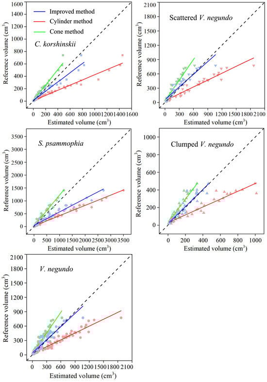 The fitting of improved volumes was checked by quantifying the relative difference with the reference volumes. Smaller deviances were observed particularly for C. korshinskii, V. negundo, and the scattered and clumped V. negundo, respectively. They had an average of 68.9%, 84.1%, 82.6%, and 85.8% smaller RD, and an average 24.1%, 62.3%, 61.7%, and 63.9% smaller RMSE than those by applying the conventional methods (Table 2). For S. psammophila, the improved method resulted in a 7.1% smaller RD and a 43.0% smaller RMSE compared to the conventional cylinder method. However, it had a comparable RD to the conventional cone method (33.4% vs. −28.0%) but a larger RMSE (358.3 compared to 101.4). Furthermore, the generally good predictions by applying the improved method were also validated via building the linear regressions between the predicted volume and measurements, where the regression line for the improved method was closer to the 1:1 reference line than those for the conventional cylinder and cone methods (Figure 5).