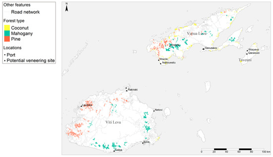 Distribution of forest types, potential veneering locations, ports, and roads in Fiji.