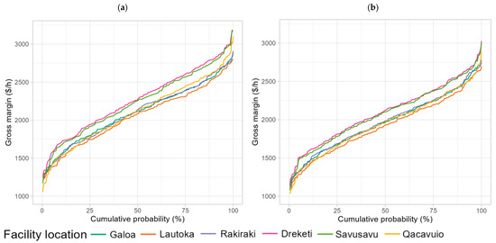 The base-case and stochastic distribution of the gross margins of veneer manufacture per hour () by processing scale and facility location are presented in Table 8 and Figure 2. Among all locations, processing at Dreketi was found to maximise (a base-case of $2266/h at 15,000 m3/y and $2098/h at 30,000 m3/y), whilst Lautoka generated the lowest among all facility location scenarios ($2046/h and $1916/h).