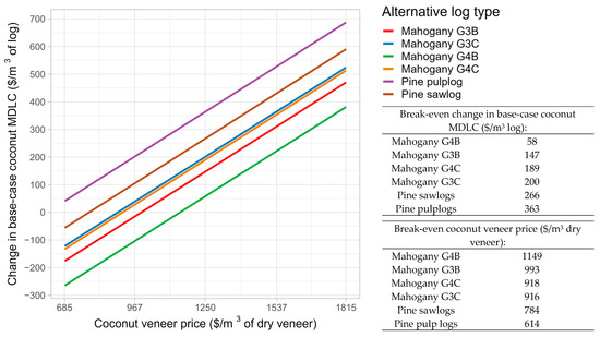 To better inform coconut procurement decisions, an investigation was conducted to determine the willingness of veneering mills to acquire coconut logs. The analysis estimates how much the base-case MDLC of coconut logs would need to vary in order for a log procurement officer to be indifferent between acquiring coconut logs or the alternative log types, over the range of coconut veneer market prices listed in Table 7. Changes in the MDLC of coconut could be interpreted as changes in the costs of stumpage, cut, snig and load, haul costs, or other costs associated with harvesting logs (e.g., administrative costs). A break-even analysis was also performed to evaluate at what market price of coconut veneer does procuring coconut logs become indifferent to alternative log types, using the base-case MDLCs in Table 4.