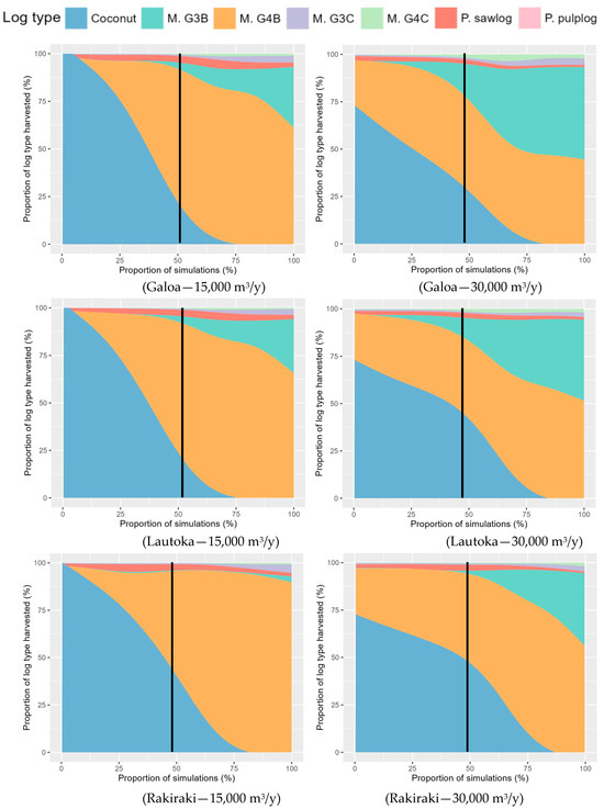 The stochastic simulations revealed that mills with good access to multiple forest types could more effectively respond to changes in the profitability of procuring particular logs from forest types since these mills could adjust the volume of each species harvested without incurring high haul costs. For example, in the case study, the mills in Dreketi and Savusavu, which were situated close to large areas of coconut, mahogany, and pine plantations, performed the best. The other mills, whilst being centrally located to large areas of a particular species (such as Galoa being close to mahogany or Qacavuio being close to coconut), often shipped logs from Vanua Levu to reach their log processing scale target, which contributed to their relatively low .