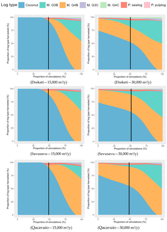 Standing log volume per hectare estimates () for the log types considered are outlined in Table 4. specifications in Table 4 are the expected means for the seven log types evaluated, with log size distributions used in the analysis presented in the Supplementary Materials. has been estimated as follows for coconut plantations. The Fijian Ministry of Agriculture recommends a planting density of 100 coconut palms per ha [36], of which approximately 30% of palms on any given farm have been destroyed due to cyclones [45]. Given that 60% of palms in Fiji are estimated to be senile and without spatially explicit data regarding the ages of coconut palms in Fiji, the analysis assumes that 42 senile palms are present and available for harvesting per hectare. Approximately six 2.6 m logs can be recovered from one senile coconut palm [45]. The of senile coconut logs is assumed to be uniformly distributed between 20 cm and 28 cm, consistent with previous empirical research [11,20,50]. From these assumptions, the log volume of each senile coconut palm was estimated to be 0.725 m3, corresponding to a of 30.5 m3/ha in year zero (the of coconut in year zero was calculated as follows: × π × 2.6 m/log × 6 logs/tree × 42 senile trees/ha). To account for current productive palms becoming senile in the future, the model assumed an additional 1/60th of the productive palms in year zero becomes available for harvesting in each year of the analysis, increasing by 0.338 m3/ha/y. The increase in of coconut per year was calculated as follows: 28 productive palms/ha in year zero × 1/60 × 0.725 m3/palm = 0.338 m3/ha.