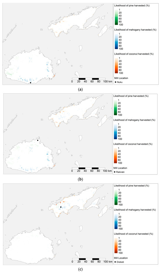 for mahogany and pine were revealed through interviews with experienced forest managers in Fiji. Experts revealed that pine is substantially higher on Vanua Levu than Viti Levu due to higher rainfall and site quality. Further details about how of pine were calculated and are described in the Supplementary Materials. levels for mahogany are averages of historic harvest data from Viti Levu. Harvesting operations of mahogany plantations have yet to commence on Vanua Levu and in the absence of data, for mahogany on Viti Levu has been adopted for plantations on Vanua Levu.
