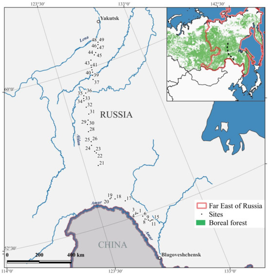 The Far East region occupies 40% of the territory of Russia with a forest area of 344 million hectares, which is 29%–38% of the total area of global boreal forests [1]. Larch forests and permafrost are mainly common here [2]. The Far East is characterized by the maximum forest burning in the boreal biome: the area of forest fires here reaches 4 million ha yr−1 and accounts for, on average, half of the total burned forest areas in Russia [1]. According to Russian forest management, a major part of the forested area in Siberia and the Far East is in the zone of “forest fire control”, meaning that fires in this zone are only observed but not extinguished [3].