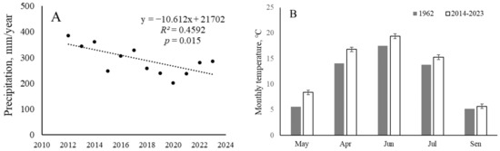 The climate of the study region is continental with average annual temperatures ranging from −8 to 0 °C, and the annual precipitation ranges from 200 to 600 mm year−1, increasing from north to south. We analyzed weather data from the Amga weather station (N 60.9018, E 131.9794) for the period 2011–2023. We also used research data [17], which presents data from the same weather station on the average air temperature for 5 months in 1962 (Figure 2).