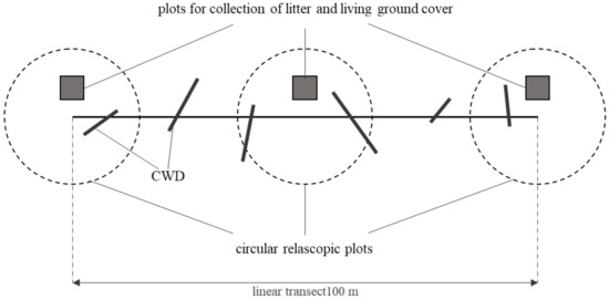 where V is the volume of CWD, m3; Di is the diameter of i CWD (i = 1…n); n is the total number of CWD on the transect; and L is the transect length, m.