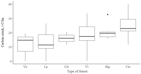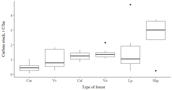 Ground cover plays an important role in the functioning of larch forests, since C stocks in this pool reach 4.7 t ha−1; the average value was 1.2 t ha−1. The biomass of the ground cover depends on the dominant species and its coverage (Figure 6).