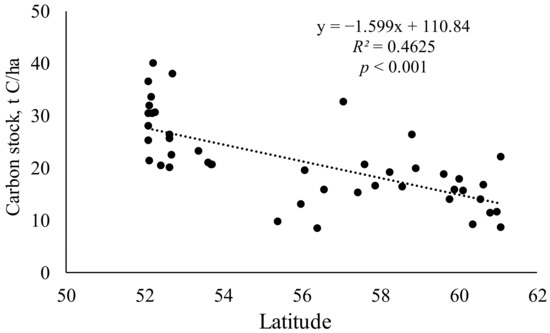 The height of 1–3 trees of each species was measured at each circular plot by electronic clinometer Haglof EC II-D (Haglof, Torsång, Sweden). The stock was defined based on stem density, average height, and species compatible taper functions. To convert the tree stock into the total C stock of the aboveground phytomass, a linear correlation was used, obtained from the data of our previous study in this region [15]. Here, we used data on the stock of stands and the exact determination of phytomass using allometric equations for each tree on an area of 0.25 hectares. The conversion equation was as follows: