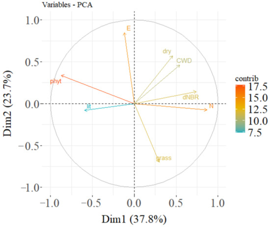 Ordination of two principal components. Phyt—living tree biomass; dry—dead standing wood; CWD—coarse woody debris; lit—litter; grass—living ground cover; N—latitude; E—longitude; dNBR—burn index.