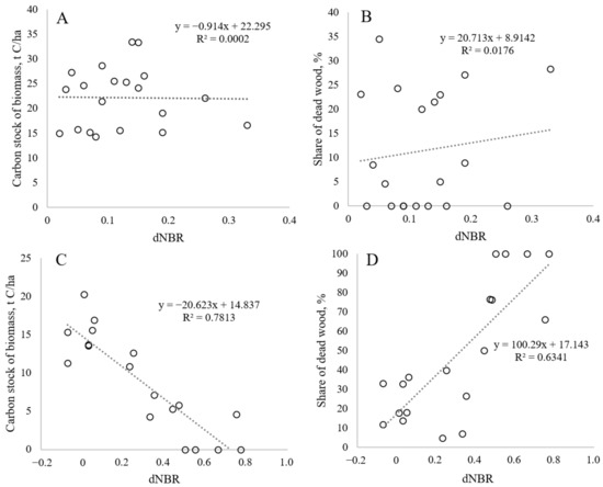 The relationship of the dNBR with the stand phytomass stock in the southern (A) and northern (C) parts of the transect and with the proportion of dead standing wood in the total stock of phytomass, respectively (B,D).