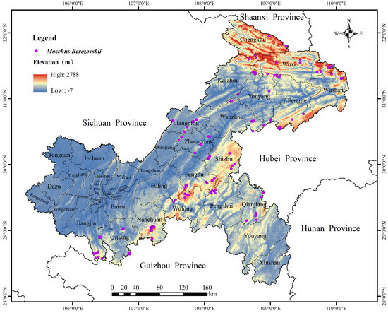 Liu, Q.; Liu, H.; Cui, X.; Peng, J.; Wang, X.; Shen, L.; Zhang, M.; Chen, L.; Li, X. Predicting the Population Size and Potential Habitat Distribution of Moschus berezovskii in Chongqing Based on the MaxEnt Model. Forests 2024, 15, 1449. https://doi.org/10.3390/f15081449