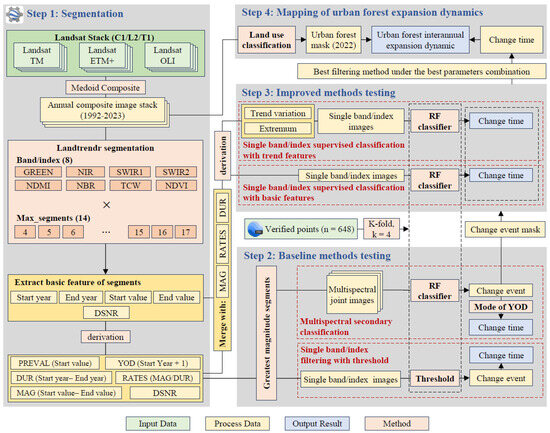 Given the lack of studies using LandTrendr for urban forests, this study aims to test the application of LandTrendr in urban forests and improve its accuracy in identifying urban forest expansion through machine learning and the features among segments. This study set two main objectives: