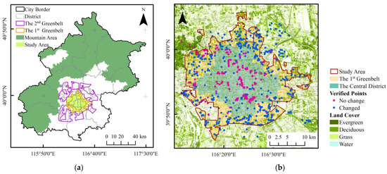 Overview of the study area and data utilized. (a) location of the study area; (b) boundary of the study area with verified points and land cover types.
