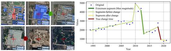 An example of the land cover changes keyframes with the corresponding segments fitted by LandTrendr under the SWIR2. The red cross in keyframes represents the sample point processed by the LandTrendr, the green arrow indicates the process extracted by the greatest magnitude of change, and the dark red arrow shows the actual urban forest construction event.