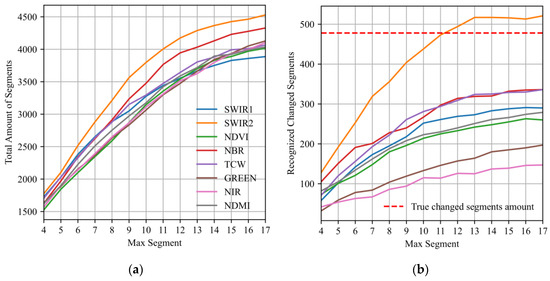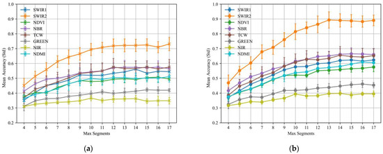 Similar to the baseline methods, SWIR2 had the highest performance. Other bands/indices performed no better than multispectral secondary classification in evaluating change time. As the max_segments increased, the accuracy of identifying change time grew steadily and then stabilized.