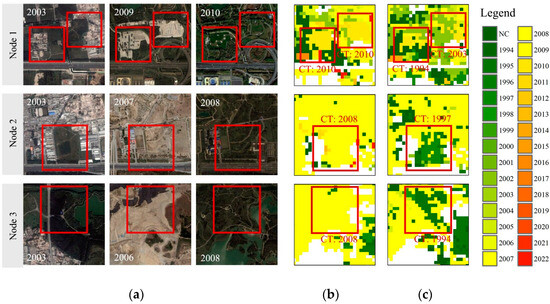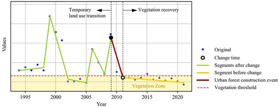 Due to the context of rapid urbanization, multiple land cover changes may occur before urban forests are planted. During this process, spectral changes often exhibit frequent and intense fluctuations. Therefore, filtering based on extreme values might mistakenly identify other land use changes as urban forest changes (Figure 3). Due to temporary vegetation during the land preparation process and sparse planting at the beginning of construction, the spectral characteristics at the time of urban forest establishment may not be distinct, potentially causing further difficulties in filtering.