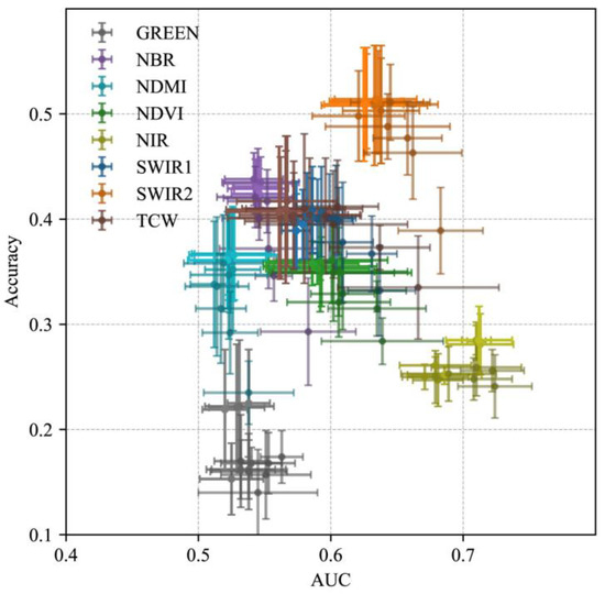 The performance of the single-band/index filtering with threshold varied considerably across different bands/indices (Figure 6). Most of the bands/indices had an AUC of between 0.5 and 0.75 in recognizing change events. In terms of the change time, more than half of the samples in the test predicted the wrong time of change. The spectral type of best performance was SWIR2, which had an average accuracy of 51.40 ± 0.05% for the change time when the max_segments was 14.
