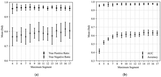 In the multispectral secondary classification, as the max_segments increased, the number of true positives in identifying change time slightly decreased, while the number of true negatives slightly increased (Figure 7a), but the ability to identify unchanged samples was relatively weak. Almost all max_segments scenarios showed stable and excellent performance in identifying construction events (Figure 7b), indicating a strong ability to distinguish no-change and changed areas, with the highest AUC being 0.98 ± 0.01 (max_segments = 16). In terms of identifying change time, the performance was generally weak.