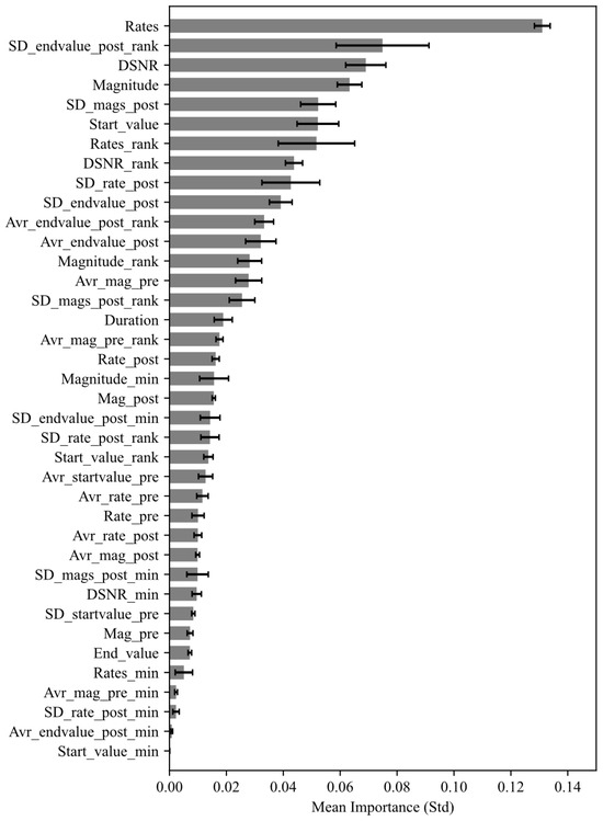 The improvement with trend features used exactly the same steps in training set construction and model training as the improved method with basic features. A total of 88 variables (Table A1) were screened by feature importance tests at two time points, and 38 feature variables were used for the final filtering test (Table 2).