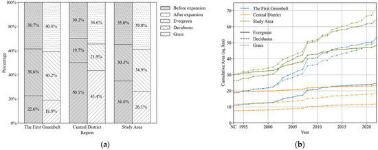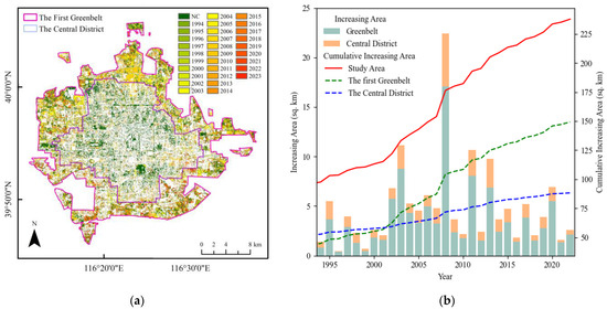 Using the improved method with trend features under the optimal parameter combination, an urban forest expansion dynamic map was established (Figure 10a). In terms of expansion in the study area, the urban forest area existing before 1994 was 96.26 km2, with an additional urban forest area of 141.35 km2 until 2022.