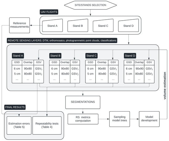The main idea was to map selected representative forest stands, with a low-cost drone, using different flight settings. Next, individual tree detection and crown delineation was performed for a particular RS layer from each flight. Based on photogrammetric point clouds, the RS metrics for individual trees were calculated. The volumes of the individual trees were estimated using a dedicated model. Finally, the stand volume was calculated as the sum of the individual tree volumes related to the corresponding stand area. The estimates derived from the different flights were compared with each other, as well as with the reference data. A general picture of the methodology is presented in Figure 1.
