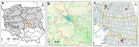 Investigation area: range of Polish lowlands (a), Skierniewice forest district (b), selected sites (c). Outline of the district in orange. A, B, C, D—selected stands.