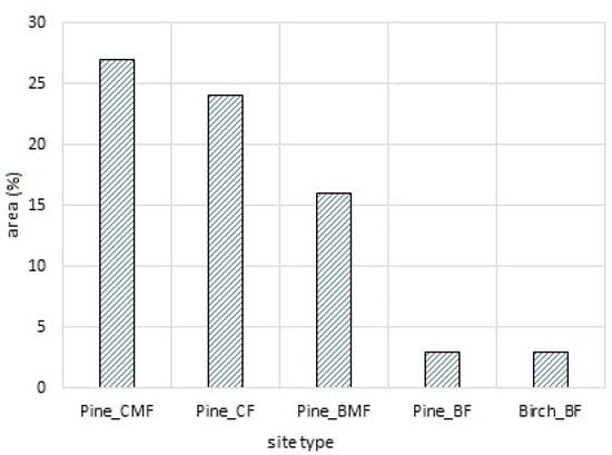 The first step was to select the most representative site type and stand characteristics typical of the Central European lowlands in Poland, as defined in Solon et al. [40] (Figure 2). The data for such preliminary analyses came from the Forest Data Bank [41], which contains a range of annually updated attributes for individual stands in Poland. Single-layered coniferous mixed fresh sites with Scots pine as the dominant tree species turned out to be the most representative in terms of the area coverage (Figure 3). The average age of the most frequently represented stands was in the range of 40–80 years. The authors restricted the search criteria for the upper age limit (i.e., 60–80 years) as these stands have a higher priority for estimating pre-harvest volume and usually are more diverse in terms of individual tree dimensions, making them better candidates for the validation method.