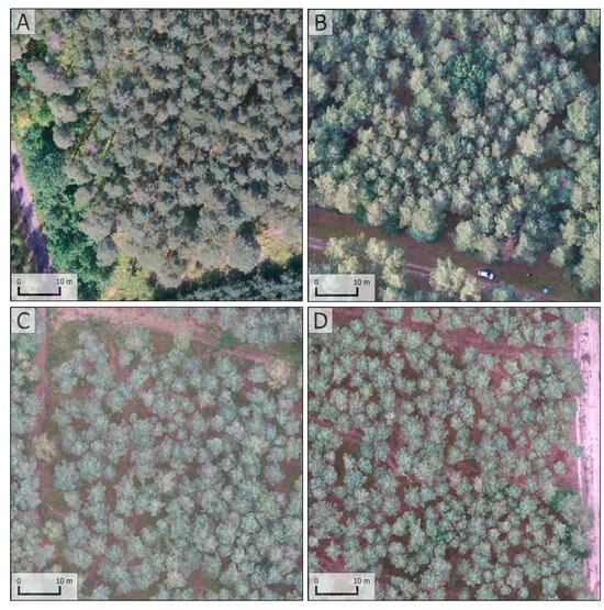 Fragments of orthomosaics presenting areas of interest within analyzed stands. (A–D)—selected stands.