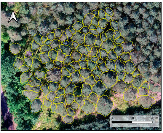 Knowing the characteristics of the target stand type, the next step was to localize potential sites. First of all, areas with prohibited or restricted flight possibilities were excluded, according to official aerial usage plans [42]. Next, a proximity/buffer analysis was run in order to select stands located in extensive managed forest areas, taking into account the 2 year project duration, the available human resources and the multitude of planned flight scenarios. Finally, a field inspection was carried out to check whether the actual condition of the potential sites matched their description in the database. Finally, four stands in the Skierniewice forest district that met all the required conditions were selected for further analysis. Table 1 contains their most important quantitative characteristics. Figure 4 shows the canopy structure as seen from above.