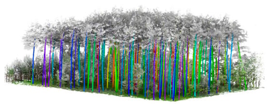 A total survey was conducted for one test stand in which the DBH of all the trees was measured with a caliper. The heights of the model trees were used to construct a local DBH-height curve, which was used to estimate the heights of all trees in the stand. Finally, the volumes of all the trees were estimated using the same allometric equations as in the previous chapter. This conventional single-stand inventory method is commonly used in Polish forest management for valuable units before harvesting [62]. Additionally, in order to obtain a second independent reference dataset, full TLS of the same stand was carried out. The TLS volumes of each tree were estimated in the same way as described in a previous subchapter. The physical boundaries of the area of interest (~0.3 ha) within the stand were marked on the edge trees. Spatial coregistration between the TLS and aerial layers was based on visual georeferencing in QGIS. Figure 6 shows the 3D representation of this validation stand according to the TLS data. Table 3 shows the quantitative description of the inventory results based on the two reference datasets.