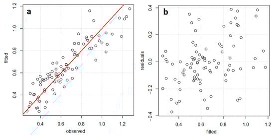 Scatterplots of the winning model, (a)—fitted vs observed, (b)—fitted vs residuals (m3).