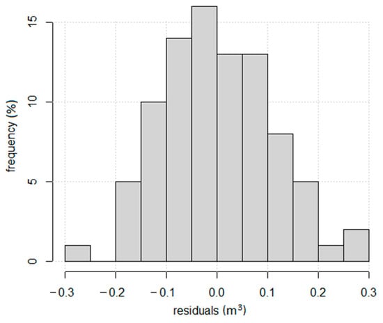 The linear regression model with two independent variables, i.e., tree height and crown area, proved to be the most accurate with an R2 = 0.82. This model was able to derive unbiased estimates for the volume of single trees. The model was cross-validated using the leave-one-out method, yielding the following results: mean absolute error (MAE) = 0.09 m3 (13.9%), relative root mean square error (rRMSE) = 17.1% and mean absolute percentage error (MAPE) for a single observation = 15.1%. All the requirements for linear regression were met, i.e., the scatterplot between the observations and estimates shows a linear trend of the model fit (Figure 7a), the residuals followed a normal distribution (Figure 8) and the estimates were not correlated with the residuals (Figure 7b). One outlier and one duplicated record were identified and removed at this stage.