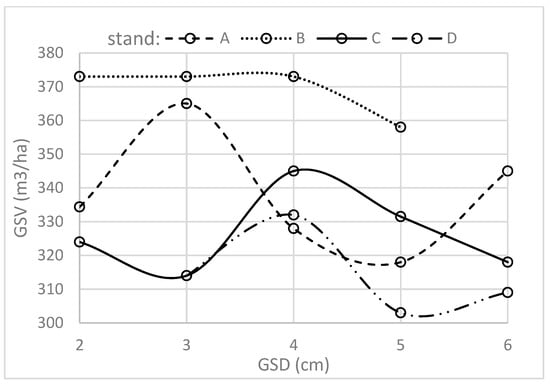 Table 4 shows the variation in UAV-based GSV estimates for each stand according to the range of analyzed ground sampling distances and photo overlap levels. There were at least six independent flights for each stand, although due to some adverse weather conditions, not all the contingencies were tested for each stand. A very low coefficient of variation (CV) from 2 to 6% was observed between consecutive flights. An insignificant declivity of GSV estimation values with coarser GSD resolution was observed for three stands (Figure 9). According to one-way ANOVA with Tukey’s HSD test, the differences between means of 25 out of 28 possible pairs of different flight settings were not statistically significant at the 0.05 alpha level (Table 5). In six out of nine cases, 80 × 80% coverage resulted in slightly lower estimates than the 90 × 90% counterparts with the same GSD (difference of 13.7 m3/ha or 4% on average).