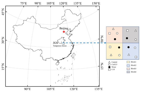 We have established a complete dual-factor random block design that includes four blocks. The vegetation, terrain, soil, and other environmental factors within the four blocks are relatively consistent. Each block has been randomly assigned with four treatments (907 m2 per plot), including control (CK), canopy N addition (addition N 25 kg·ha−1·yr−1), canopy water addition (addition of water equivalent to 30% of the local precipitation, 336 mm·yr−1), and canopy N and water addition. A 20 m buffer zone is established between any two treatments, and a cement board with a depth of 50 cm is buried between the buffer zones to prevent mutual contamination between the treatments (Figure 1).