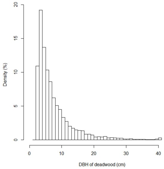 Tree mortality plays a crucial role in determining the structure, composition, and evolutionary processes of forest ecosystems []. It significantly impacts the composition of species, which in turn affects community characteristics, along with the accumulation of nutrients and biomass []. Consequently, comprehending tree mortality is vital for understanding the dynamics of forests. This research contributes to the existing knowledge by analyzing the variations in deadwood biomass over a span of five years, highlighting its consequences for the health and management of forests [,].