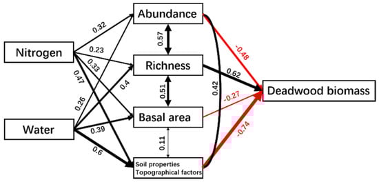 Nitrogen and water addition had negative effects on deadwood biomass storage indirectly via influencing community characteristics in the study area, because there are no significant differences between nitrogen addition treatment or water addition treatment with CK, respectively. Specifically, N addition indirectly influenced deadwood biomass via negative effects on abundance, soil properties, and basal area (Figure 4). However, water addition indirectly increased and decreased the deadwood biomass of this temperate forest via increasing deadwood richness and decreasing abundance, basal area, and soil properties. The impact pathways of nitrogen and water addition on the biomass of dead trees in warm temperate forests are different.