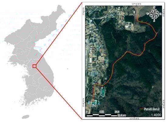 The study area is located in a forest road section near Jikdong-ri, Soheul-eup, Pocheon-si, Gyeonggi-do, South Korea (37°45′45.975″ N, 127°10′31.687″ E). Videos were collected while driving a tracked forwarder back and forth along a 1.2 km road section (Figure 1). Three cameras (DFK 36CR0234-I67, The Imaging Source, Bremen, Germany) were installed to obtain simultaneous video recordings from the left, right, and center viewpoints (Figure 2). These recordings captured the same driving route under various weather conditions. Each drive lasted approximately 20 min, resulting in a total of 120 min of video footage across six drives. Since the shape and brightness of the forest road seen in the captured image could be changed by the amount and the incidence angle of the light source, we tried to take photos on various ambient light conditions such as in the morning, and in the afternoon on three different levels of cloudiness as shown in Table 1, considering the average amount of cloud as a meteorological variable. In addition, since wood harvesting work is not performed in rainy or snowy weather conditions because it is dangerous, experiments were conducted by varying only the light source and the average amount of cloud that can affect the angle of incidence. Frames were extracted from the videos at regular intervals, ensuring that images did not overlap during training. A total of 633 images were extracted from the videos recorded from the three directions. The extracted images were saved in JPEG format with a resolution of 1920 × 1080.