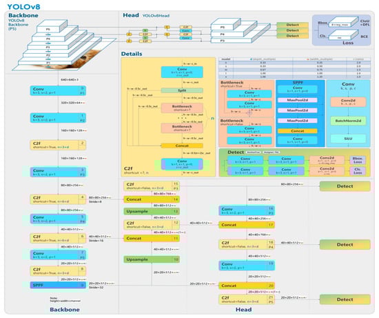 In general, deep learning-based object detection techniques integrate a classification step (to determine meaningful objects within the image) and a localization step (to estimate the location of classified objects). Widely used techniques include You Only Look Once (YOLO) and regions with convolutional neural network (R-CNN) features. Since Redmon et al. [27] first proposed “You Only Look Once: Unified, Real-Time Object Detection”, various algorithms based on YOLO have been developed, including YOLOv4, YOLT, and the latest version, YOLOv8. YOLOv8 shares the same architecture as YOLOv6 but incorporates significant improvements, such as a new neural network architecture that utilizes both feature pyramid network (FPN) and path aggregation network (PAN), along with new labeling, offering a variety of enhancements over previous versions [28]. YOLOv8 uses the modified CSPDarknet53 backbone as its feature extractor (Figure 4). The CSPLayer used in YOLOv5 has been replaced with the C2f module, and the spatial pyramid pooling fast (SPPF) layer accelerates computation by pooling image features into a fixed-sized map. Each convolution applies batch normalization (BN) and SiLU activation. The head module of YOLOv8 is divided into three branches, each independently responsible for a specific task: processing objectness, classification, and regression [29].