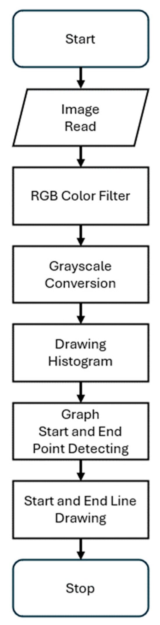 YOLOv8 segmentation was used to separately extract regions containing masked forest roads. An image post-processing algorithm was then added to compute the center of the extracted forest roads. This center extraction algorithm employs functions provided by Python-based OpenCV, as detailed in Figure 5.