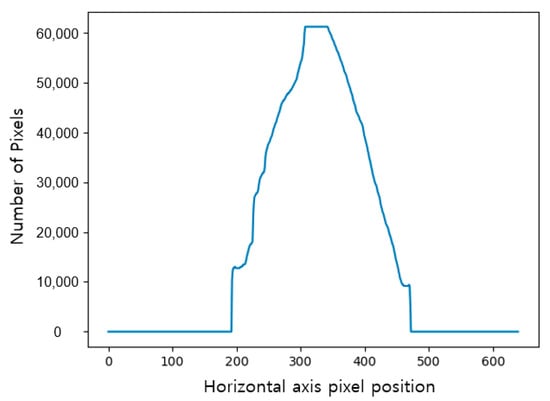 The areas recognized as forest roads were separately extracted using the image-based forest road center extraction algorithm. The road edge lines were detected using a histogram. Figure 9b shows the image with the road area blue-masked on the original image in Figure 9a. The masked image was then processed with an RGB filter, changing only the blue areas to white and the rest to black (Figure 9c). This binarized image is used for generating a histogram, representing the sum of the pixels along the X-axis. Due to perspective, a road in the histogram typically appears in a trapezoidal shape, and the coordinates of the left and right edges of the trapezoid base are calculated and extracted.