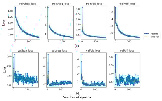 The training loss values of the YOLOv8 model across different epochs are plotted in Figure 7a,b. Overall, the loss values show a consistent downward trend, indicating that the model’s performance progressively improved during training. Convergence to low and stable loss values across all loss types further demonstrates the model’s effective learning from the datasets.