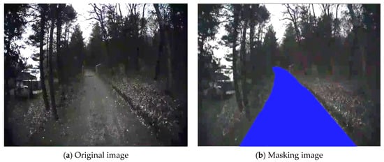 The image size was adjusted to 640 × 480 pixels to facilitate the training and testing of the model. From the total 633 images captured under natural conditions, 533 were randomly selected and adjusted to meet the input requirements of the YOLOv8 model. The dataset was split into training (80%), validation (10%), and test (10%) sets. Once deep learning training was completed, the test set was used to evaluate the model’s performance with images captured under different conditions. To create mask images following the shape of forest roads, polygonal regions were manually annotated using the visual geometry group (VGG) Image Annotator program [26]. Figure 3a,b shows examples of manual masking along the contour of the forest road in the image.