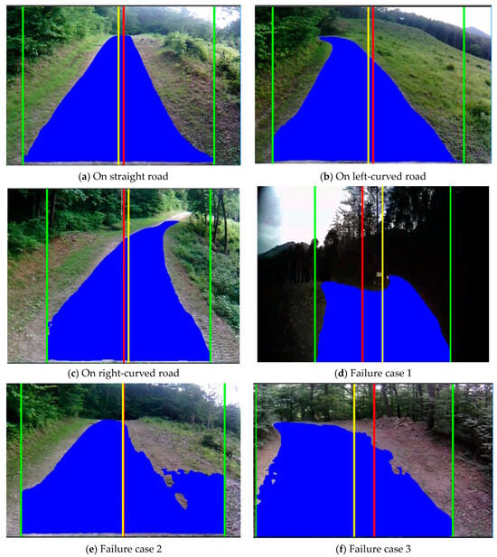 Figure 10 illustrates the results of applying the image-based forest road center-extraction algorithm to images captured while driving on forest roads, including straight sections and corners curving left and right. Despite using images captured under different conditions to those used for deep learning model training, the algorithm successfully recognized these road features and correctly extracted the road center (Figure 10a–c).